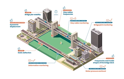 - Combined monitoring: the most effective strategy for bridges because it connects quasi-static deformations with dynamic response.