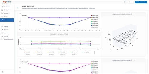 The MyMove Modal Analysis Tool processes time series from synchronized accelerometers to estimate natural frequencies and mode shapes and tracks their evolution over time. AI-based algorithms trained on historical project data ensure more stable identification under variable operational conditions, including traffic, temperature and wind. Engineers benefit from avoiding manual workflows across multiple software, having modal estimates, sensor mapping and historical trends in a single view, reducing the time between data acquisition, validation and interpretation, and standardizing technical documentation for audits and decision-making.